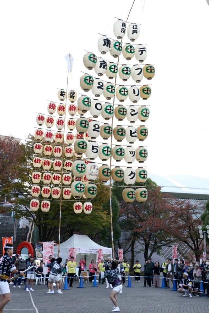 オープンした14日には、大会の成功を願い、「にぎわいエリア」で秋田竿燈まつりや阿波踊りのデモンストレーションが行われました。
