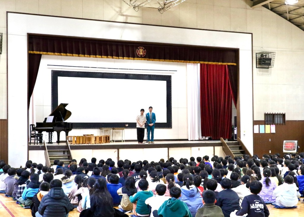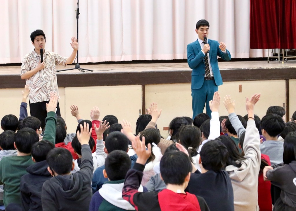 児童たちの前に登場した豆鉄砲の二人は、「今年で3年目になりますが、みんな『年に1回来てくれている人』だと認識してくれていますね」と児童たちの歓迎の様子に笑顔を見せます。