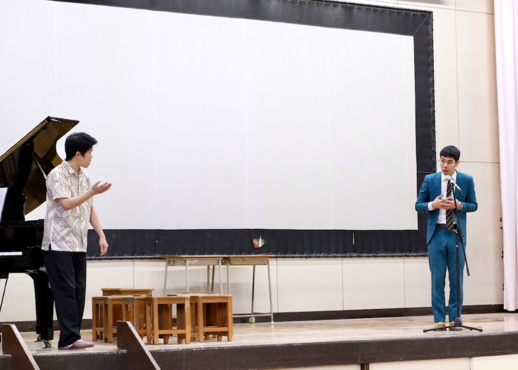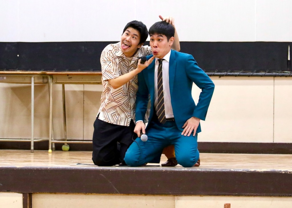質問コーナーが終わったあとは、さらに豆鉄砲がネタを披露。ネタの途中にホセさんが舞台から降りて東さんを探し回り、児童たちも大盛り上がり。