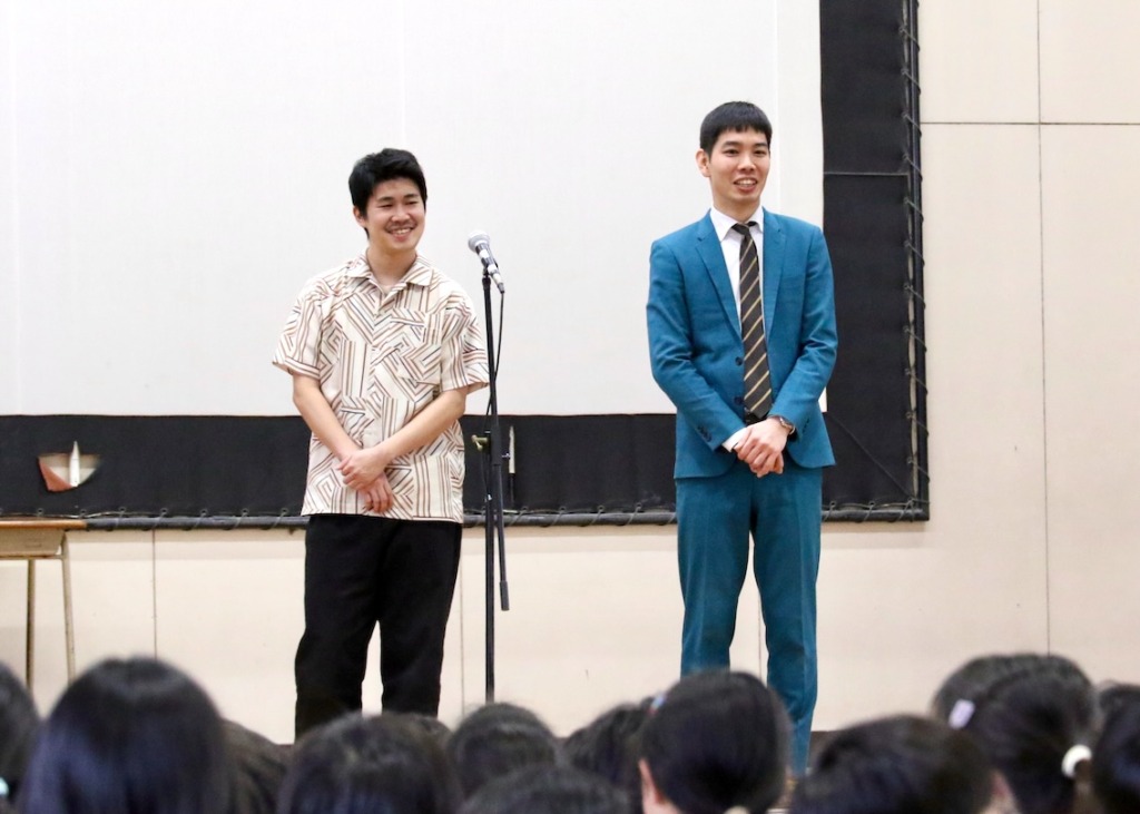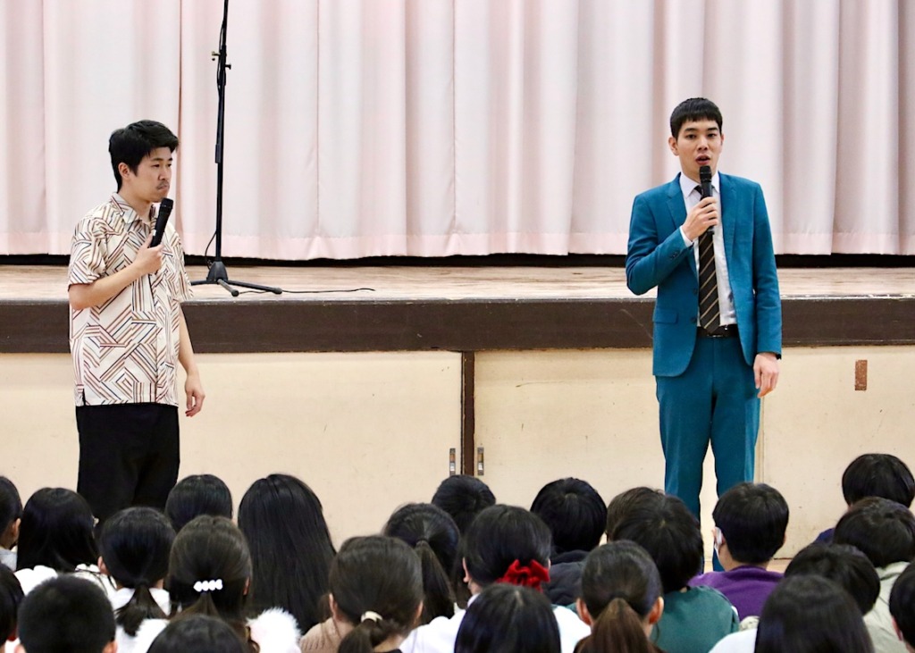 豆鉄砲の二人は、将来を考えるうえでのアドバイスや、お笑い芸人になるまでの道のり、仕事への思いについて児童たちに話しました。