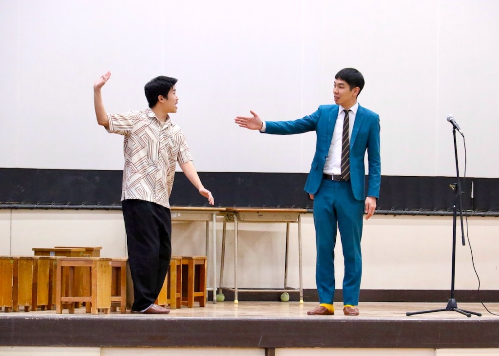 4年生は、豆鉄砲の二人を驚かせることに。児童が3人出てきて、「お笑いのネタをするので、そのあと質問に答えてください」ということで、まずは4年生がネタを披露。