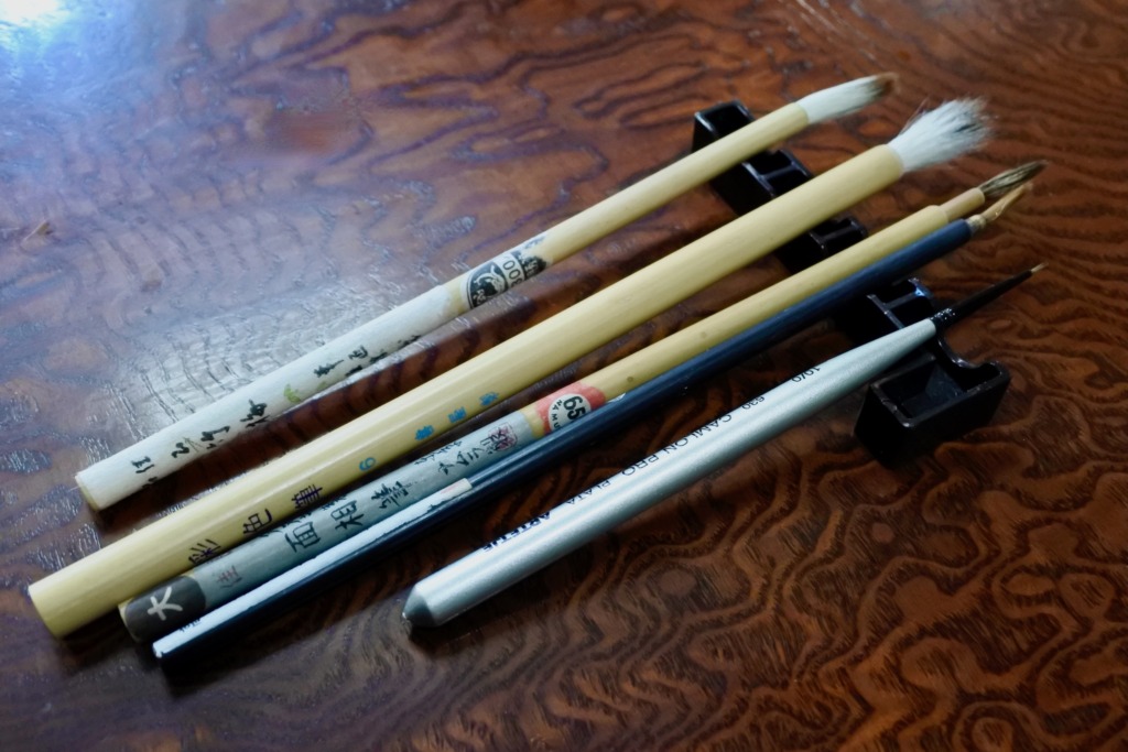 今は日本画で描いているので日本画の筆を使用していますが、『しらすどん』のときに使ったアクリル絵の具用の細い筆も使っています。