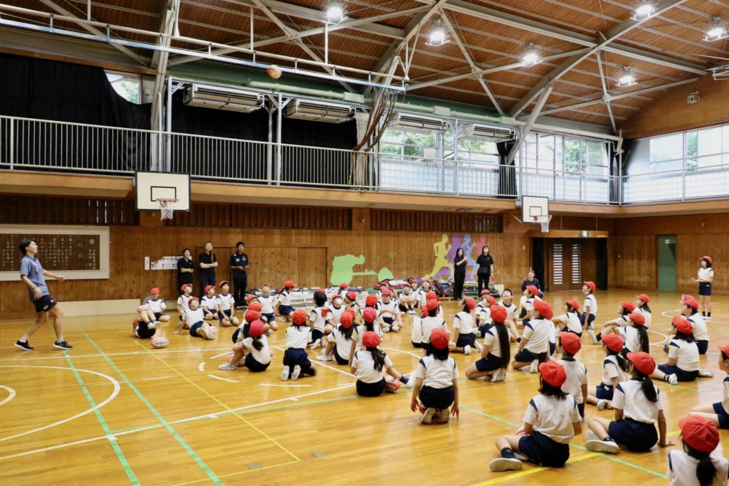 安藤選手がけったボールは、体育館の天井付近に届くほどに高く飛んで、児童たちの頭の上を大きく飛び越えていきます。またもや児童たちからは歓声が上がったり、拍手が起きたりしました。
