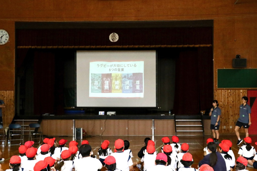 次に「ラグビーが大切にしている5つの言葉」と題して、ラグビー憲章で述べられている5つの価値(品位・情熱・結束・規律・尊重)について、「品位=正直に行動すること」、「情熱=あきらめずに挑戦すること」、「結束=仲間と協力すること」、「規律=ルールを守ること」、「尊重=仲間や相手を大切にし、礼儀を忘れない」ということを、学校でのシチュエーションなどを交えながら、安藤選手と安尾選手が、児童たちにわかりやすく説明しました。