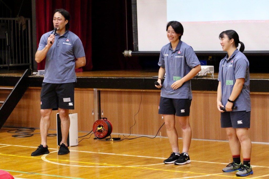 講師は、3大会のワールドカップに出場しているラグビー元日本代表でレジェンドの大野均さん、女子ラグビーチーム「BRAVE LOUVE」に所属し、日本代表選手としても活躍している安藤菜緒選手、安尾琴乃選手、そして、全国各地で子どもたちにラグビーやタグラグビーの指導を行っている、公益財団法人日本ラグビーフットボール協会の向井陽さんの4名。