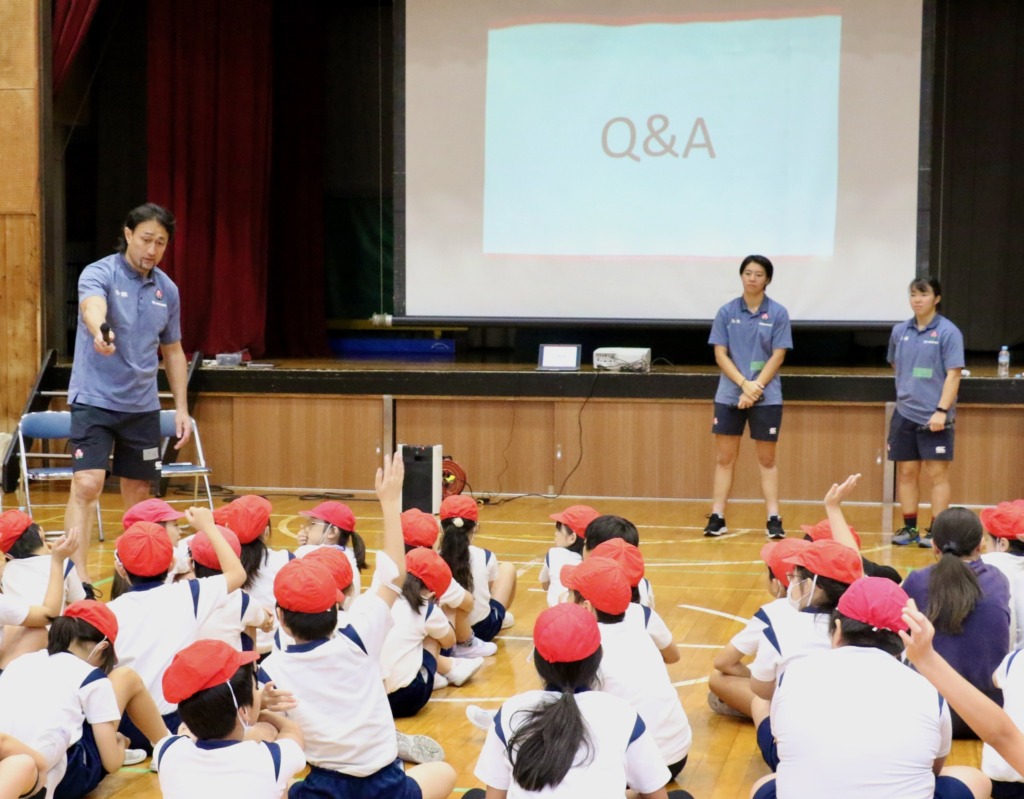 「どうしてラグビーの選手になったのですか?」という質問には、「タグラグビーを小学校からやっていてラグビーボールを触る機会が増え、中学のときに恩師からラグビーをやってみないかと誘われて、ラグビーを始めました」と安藤選手、「わたしは父親と兄がラグビーをやっていたので、練習を見に行ったりしていて、鬼ごっことかをしているのが楽しそうだなって思って始めました」と安尾選手。大野さんは「高校生まで野球をやっていたので、大学でも野球をやろうと思っていたら、この体格を見た先輩たちから、ラグビー部に勧誘されました。見学に行くと先輩たちが楽しそうで、仲間になったら大学生活も楽しくなりそうだなと思い、入部してラグビーを始めました。身長が高く、体の大きい選手がなることが多いロックというポジションで、23年間プレーしました。きっかけはそれぞれですが、みんなラグビーが大好きなんです」と児童たちに話しました。