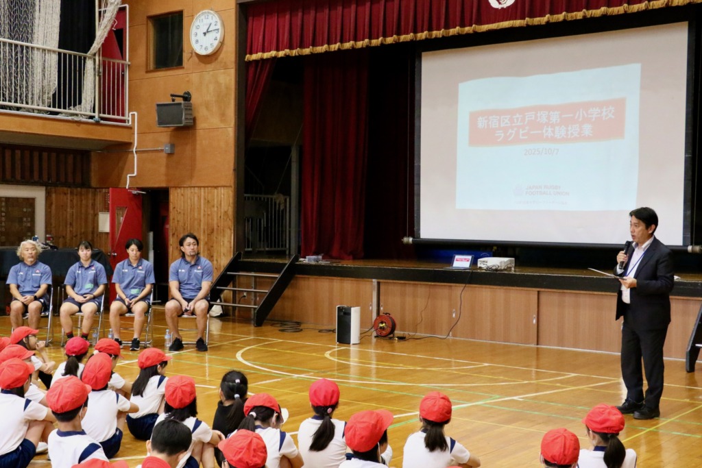 10月25日(土)に、国立競技場(東京都新宿区)にて開催される「リポビタンリポビタン D チャレンジカップ 2025 日本代表 vs オーストラリア代表」に向けて、10月7日(火)に、東京都の新宿区立戸塚第一小学校にて、小学4年生の児童たちを対象に、ラグビーについて学ぶ体験授業が行われました。
