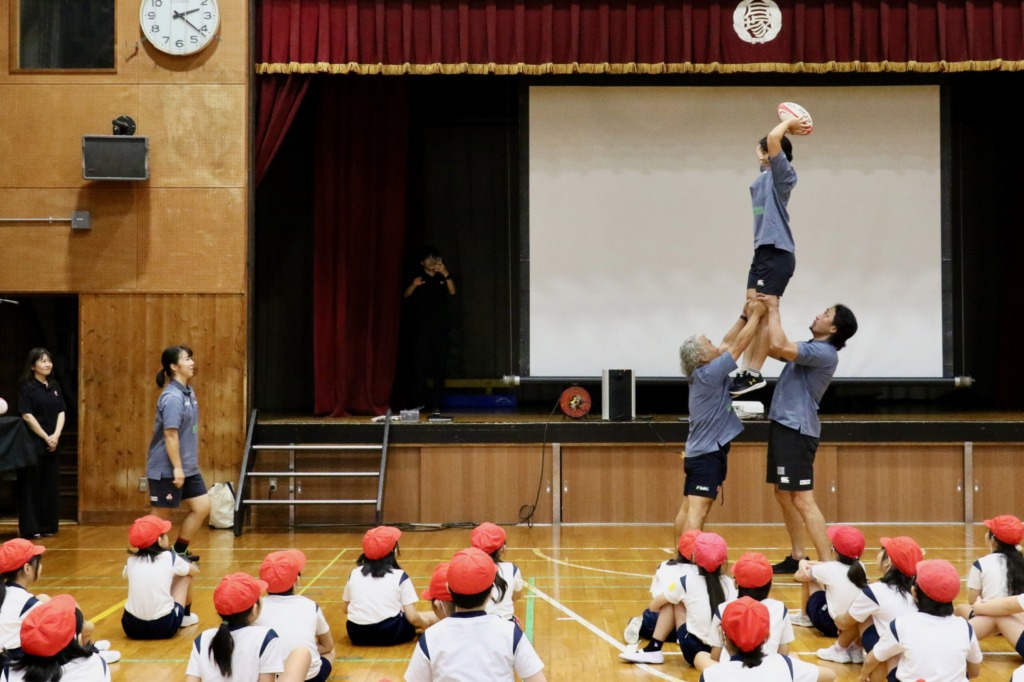 ラインアウトを、児童たちも体験。なかなか体験できないだけに大野さんたちに持ち上げられると、その高さにおっかなびっくりの表情をする子もいましたが、みんな笑顔で楽しそうでした。