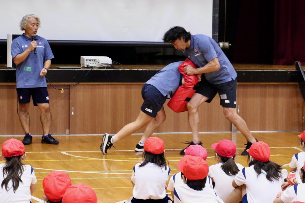 授業のあと、児童たちは、「キックがすごく高くて、体育館の天井につきそうなくらいだったのが印象的でした」、「ラインアウトで高くなるのは小学生ではなかなか体験できないから、とても楽しかったです」、「思いっきりタックルするときがいちばん楽しかったです」などと、うれしそうに感想を話してくれました。